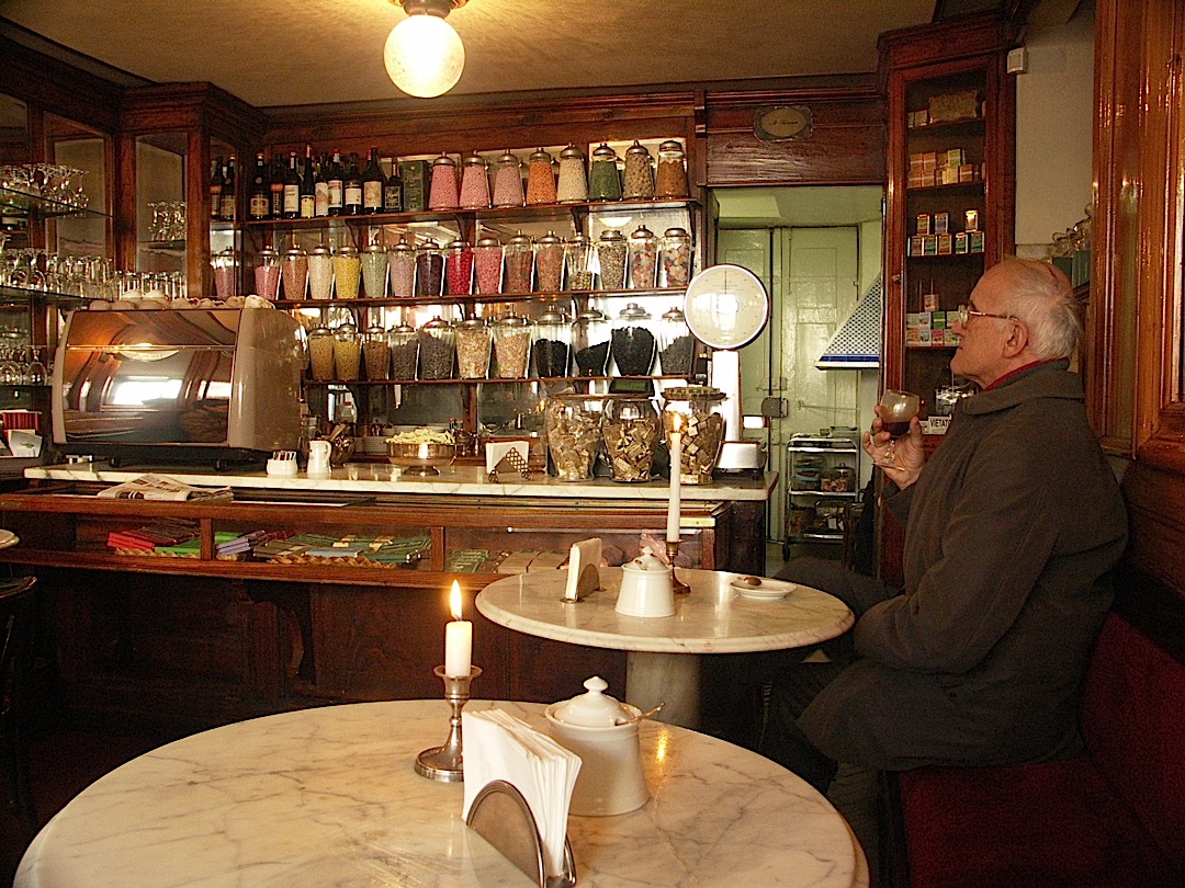 “Not even the Italians know Turin! They only know FIAT! FIAT! FIAT!” So said Michele, a spry, elegant, elderly Turinese who took my wife and me for a cup of rich bittersweet coffee and chocolate called a “capriccio” at the historic Caffè Baratti e Milano (below), opened in 1875 on Turin’s broad Piazza Castello. We’d met him just minutes before on our search for the equally famous café named Bicerin, only to learn from Michele that it was closed on Wednesdays. He didn’t seem troubled by his statement that the world outside of Piedmont, including the rest of Italy, did not regard his hometown as worth visiting, unless it was to see the Automobile Museum. “It is not a bad thing not to have so many tourists,” said Michele, who had a salt-and-pepper beard and wore an artfully thrown scarf around his shoulders. He never gave us his last name and who seemed to have retired to the life of a boulevardier known to every bartender and barrista in Turin.
