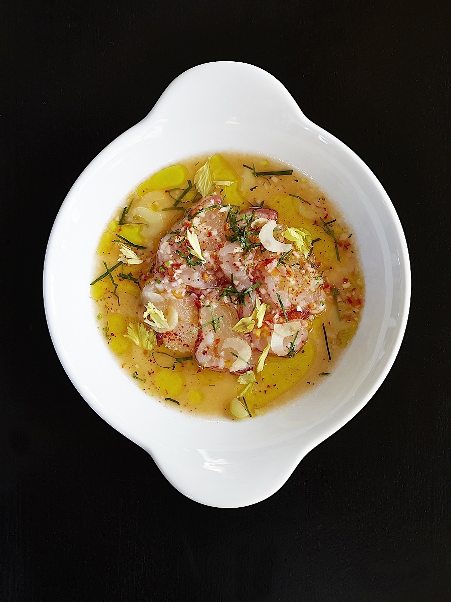 with a spicy shrimp broth, enriched with lemon