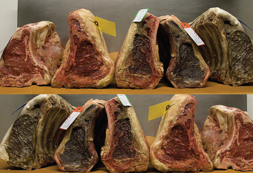 The invention of vacuum packing in the 1970s brought about “wet aging,” whereby meat is placed in a plastic bag and stored in a refrigerator (right). This method allows the meat to age in its own juices, sometimes leaving behind a slight metallic flavor. When using this technique, the meat doesn’t have to be trimmed, saving a lot of meat and keeping costs down. Today, a vast majority of the beef market uses wet-aging techniques, somewhere around 95%. Dry aging is a very expensive business to get into. Customers should check the restaurant menu and make sure it specifically states “Dry aged for xx days.” Want a little more confirmation? Ask to see the dry aging setup.