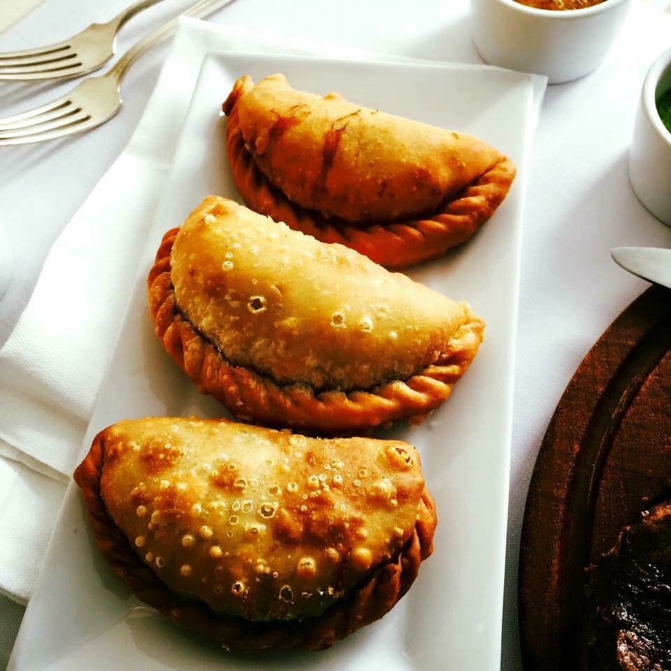 We began with a slew of regional empanadas within crisp pastry ($12), one of beef, one of chicken, one of Swiss chard and manchego cheese (below), along with a hefty platter of Argentine chorizo, blood sausage, Spanish chorizo ($21), which went very nicely paired with a vinegar-and-old graced watercress salad ($10).