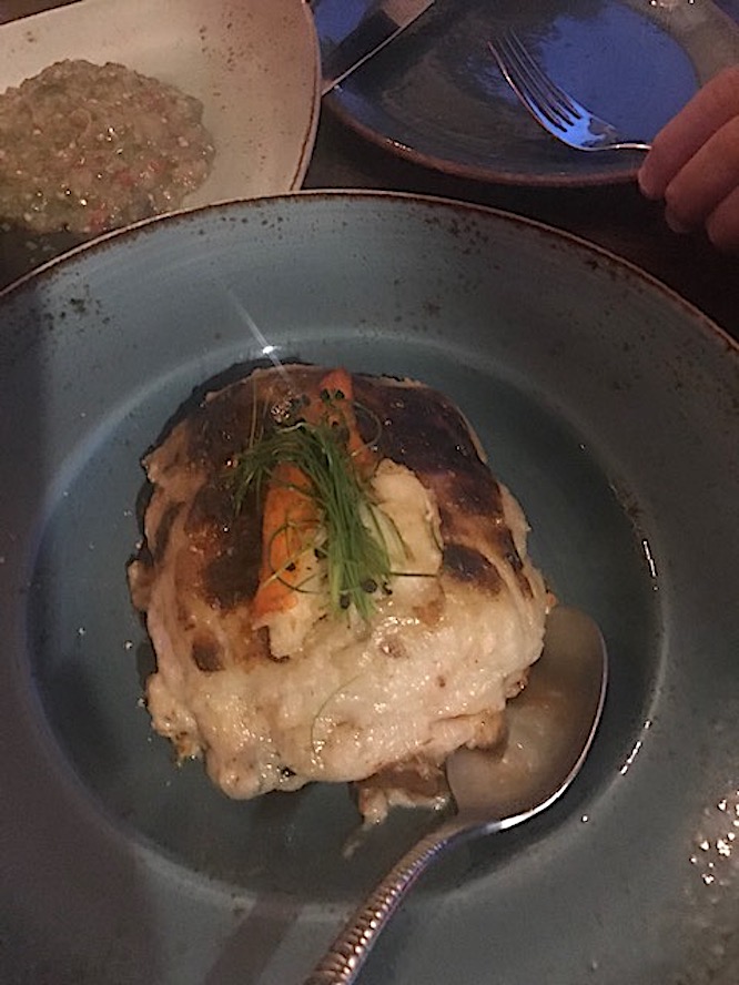 addictive as ever.The best of the main courses was a bountiful seafood casserole at an amazing price ($29.95), chock full of shrimp, lobster, scallops and whitefish laced with Monterey jack, baked with sherry garlic butter and sided with garlic-leek brown rice and roasted carrots in a romesco sauce (below). Every element coalesced into a lavish, Lucullan feast. Lemon gray sole is a