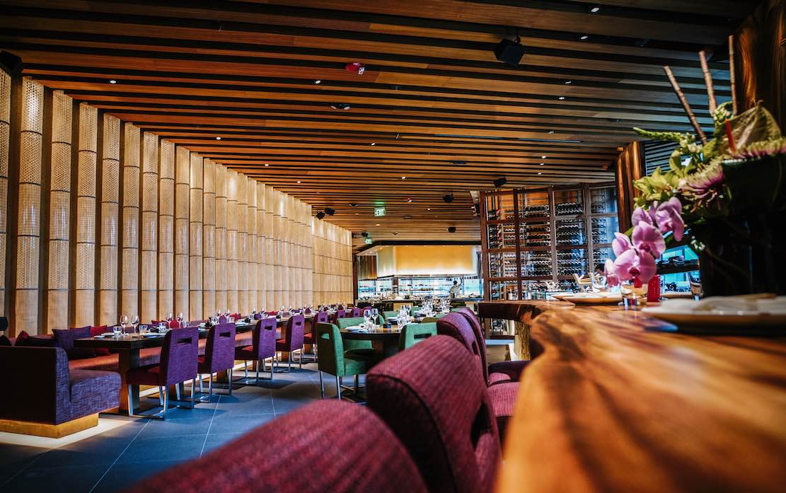 and robata kitchens. The brand new Boston branch, set adjacent to the new Four Seasons Hotel wedged into Dalton Street (not the one on the Boston Gardens), is “inspired by the four elements of earth, fire, water and air,” a 21st century concept seeking a Millennial crowd. Techno music via a “floating” DJ is pumped into the room at full blast. (More on this in a moment.) As with Legal Sea Foods, the quality of the ingredients is paramount, though meats are also in array. Chef Helmy Saadon, formerly of Zuma’s Dubai unit, researched the Boston and New England markets for his gargantuan needs, as well as bringing in fish from the Pacific. The