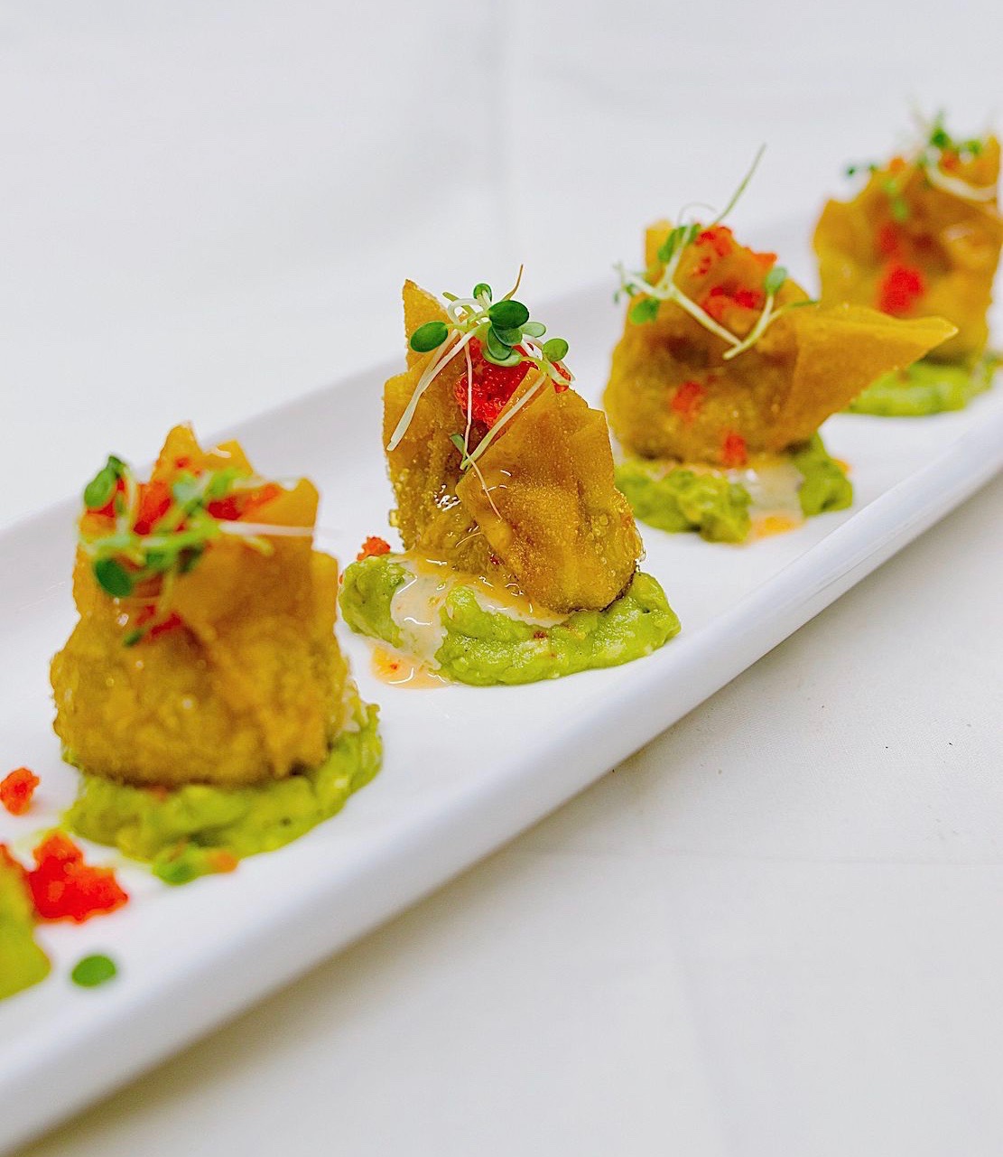 There’s not much to the décor—basically a low-lighted 70-seat room with bare tables and a brightly lighted sushi bar and counter to the rear. The reception by owner David Sunarto will be warm, the service cordial; the food will be exceptional, from dumplings and sushi to special dishes created by partner-chef Nakao Hirakata and his staff. Now seven years old, Mizu has a very regular clientele, and at lunch reservations are always necessary; on weekday nights, the crowd piles in before six, but empties out by nine. When I first perused the menu, which took some time, I wondered whether a selection of so many dishes could possibly be handled with equal aplomb, but after an extensive tasting from most categories, I saw no lapses in preparation and was delighted by the chef’s special dishes, like the lustrous “white tuna truffle,” quickly seared tuna dressed with truffle oil and yuzu, and a carpaccio of yellowtail with yuzu and jalapeño chili pepper, reflecting a Peruvian-Japanese connection. The fact that these dishes cost only $15 each is nothing short of amazing.