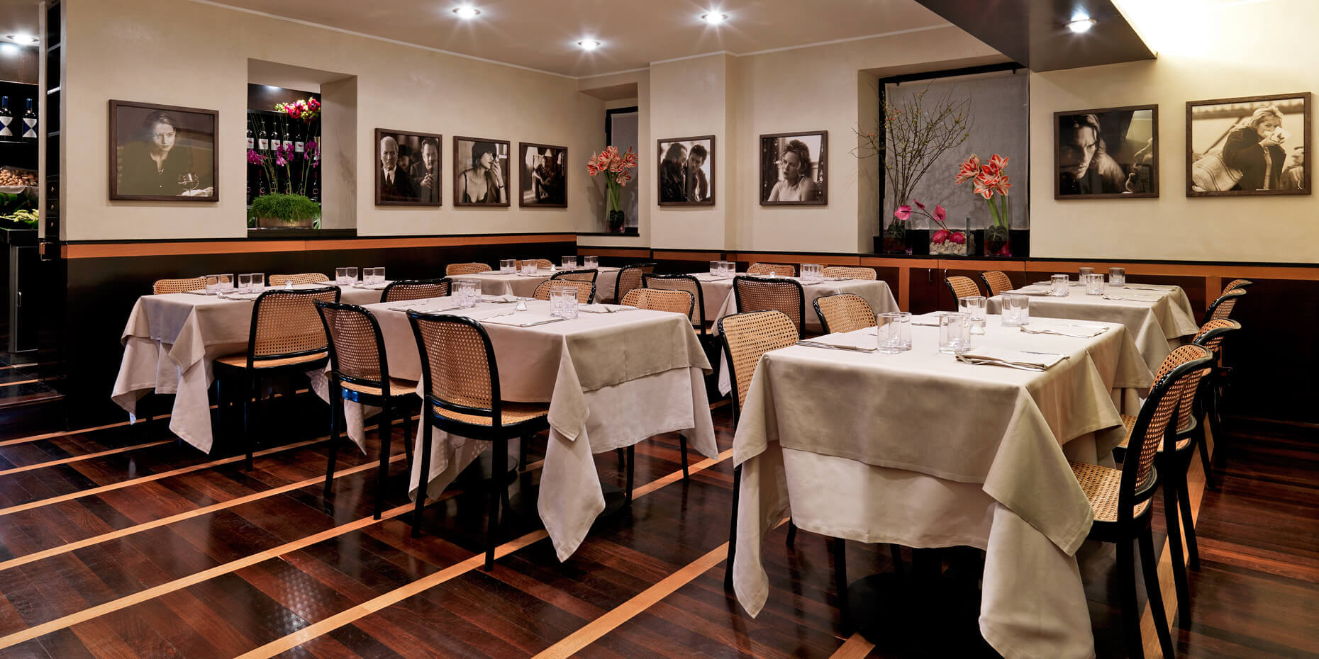 chew. For that reason it became the rage in the 1980s with the skinny fashionista crowd, and the owners wisely opened a place in New York (now closed), followed by Istanbul, Manila, Hong Kong, Doha and Goa. Of these I cannot speak, and chains are of little interest to me, but the Milan original still retains the same la dolce vita spirit and good food it has always had. Snootiness is not part of the place’s character. The restaurant’s two-level décor is, after many years, still quite stylish in black, beige and white, with wicker chairs, roses everywhere, its walls hung with