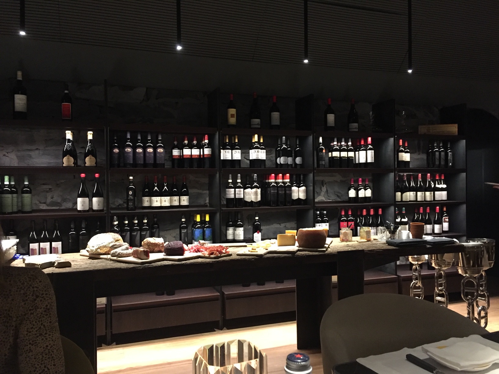 lighting, with a handsome wine wall and a wide