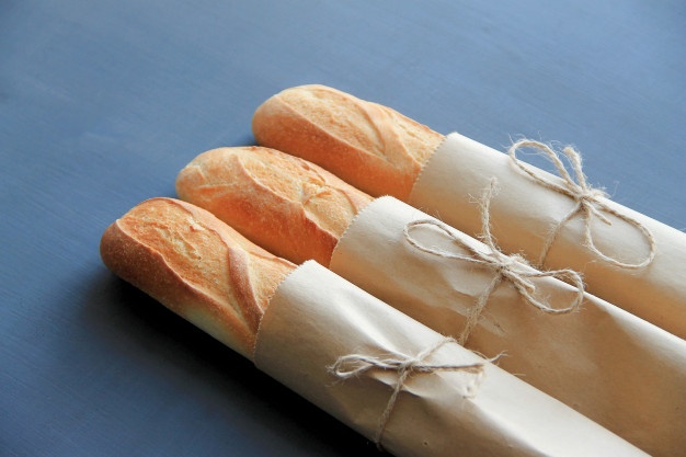 by a paper-wrapped baguette and a carafe of