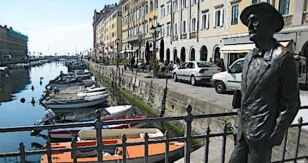 granted the people a good degree of autonomous rule.Trieste is still a lovely old fishing port, sometimes called the “Austrian Riviera,” and, at the end of the 19th century, it shared with Vienna a high reputation for art and literature, drawing Sigmund Freud and James Joyce by its quiet, dignified character. Indeed, Joyce has a statue on the waterside, striding and, being terribly nearsighted, looking like he’s trying not to fall in (below). He had come to the city in 1904 with Nora Barnacle (whom he married in 1931), and spent several years there, finishing his short story collection Dubliners and