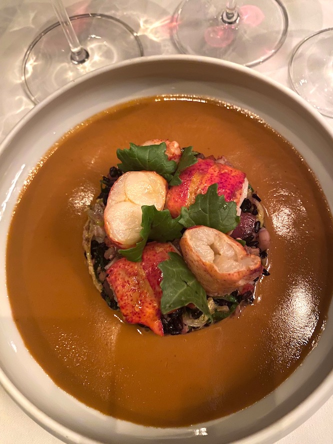 Black sea bass was impeccably cooked and fleshy, served simply with sautéed baby spinach and a citrusy caper-flecked classic grenobloise. Poached Maine lobster came with forbidden black rice, Napa cabbage, lemon grass and a Thai red curry reduction. There is a cheese course available ($30 supplement), then beautifully
